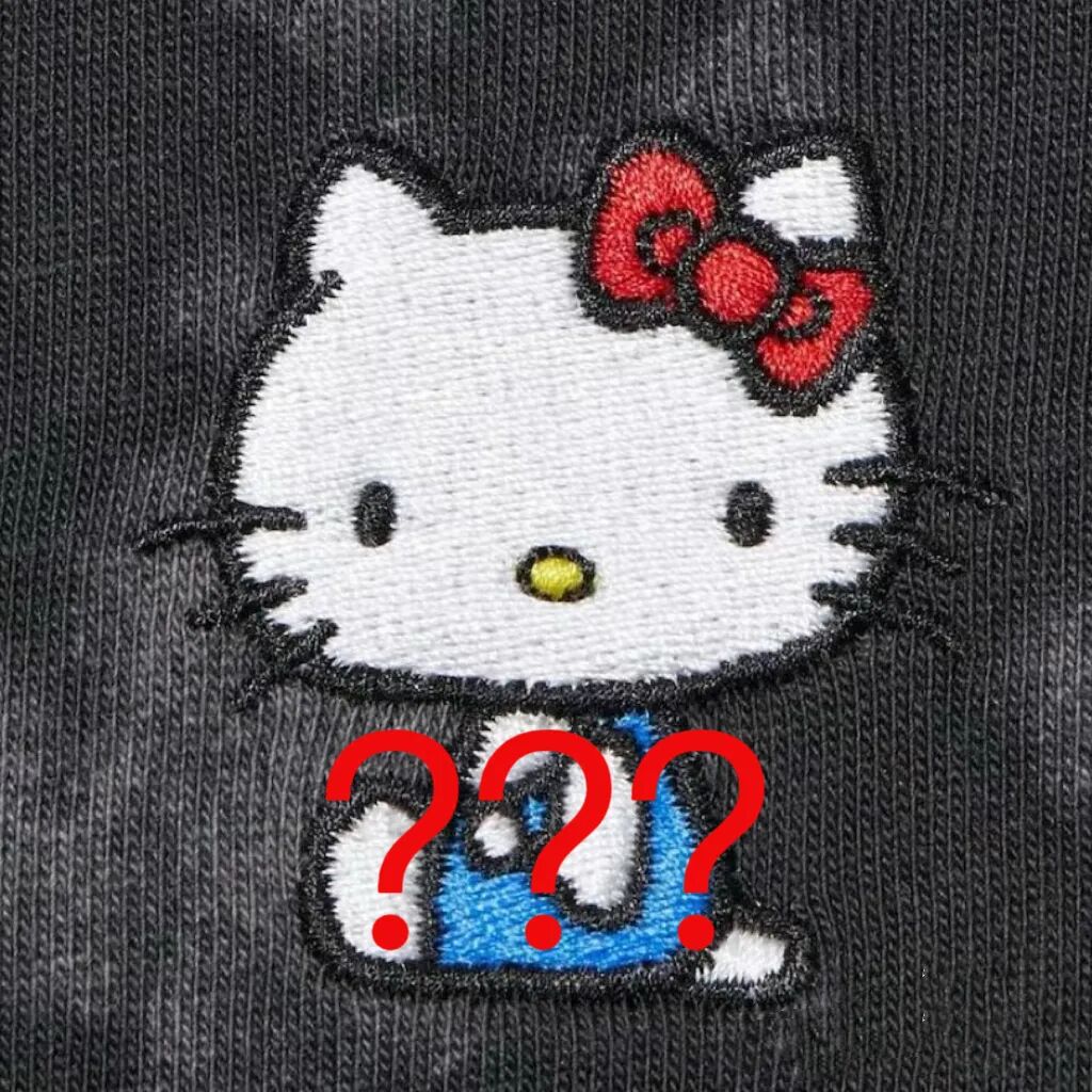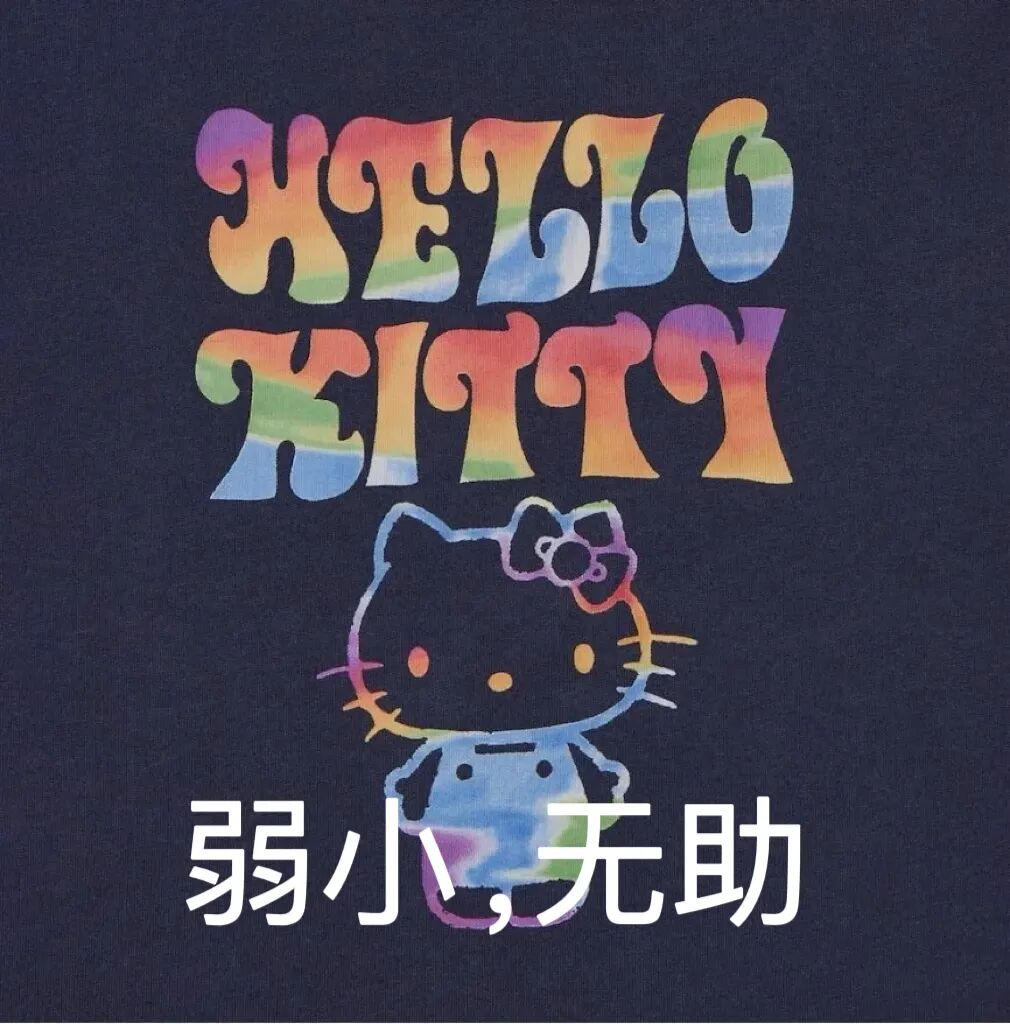 乍眼一看,还挺好看。别误会,我是说肤白貌美的女模特。再看T恤上的Hello Kitty印花,属实让人眼前一黑。原本甜美可爱的Hello Kitty,经典的红蓝粉色不见了,漂亮的背带裤上,像是贪玩时蹭上了颜料,看起来脏兮兮的,完全成了一个小土妞。此刻我从Hello Kitty的表情上只看到了四个字:弱小,无助,整个一emo kitty。