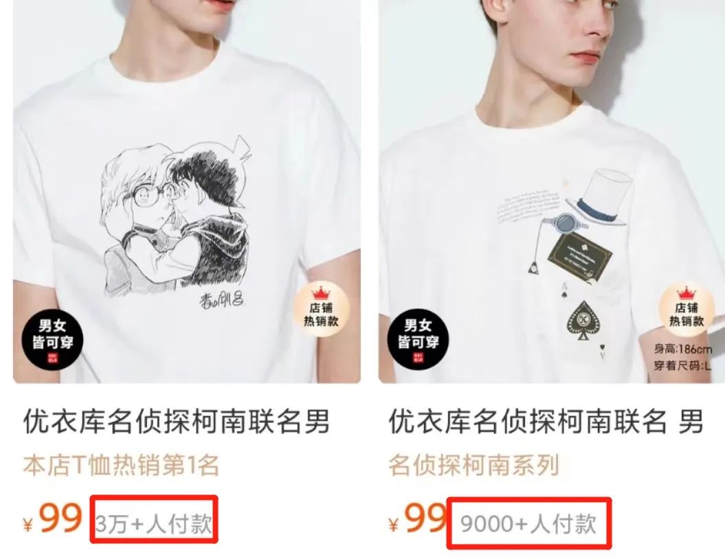 同时,在二手市场,售价99元的联名T恤,一度被黄牛炒至10倍至近千元的价格,仍是一件难求。2023年,优衣库与《名侦探柯南》联名T恤发售,再度引起话题热议,更掀起了一场“新兰党”和“柯哀党”两大CP阵营的骂战。其中一款印着柯南和灰原哀亲密互动图案的T恤,更加助推了骂战的升温。而优衣库则直接躺赢,这一“柯哀CP”款仅在官方旗舰店就售出3万+,销售额约300万。