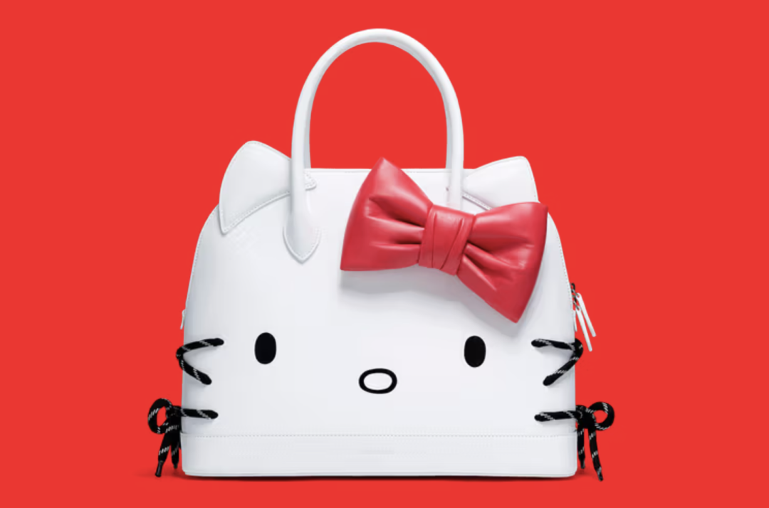 奢侈品牌Balenciaga与Hello Kitty的联名,走的则是大气简约的时尚路线,用黑色绳结代替猫咪胡须的设计,非常巧妙可爱。