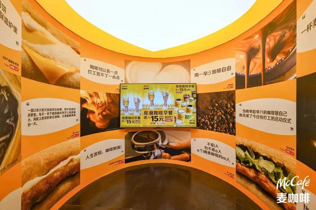 放眼望去,采用汉堡黄色调,整体是一个巨型麦咖啡,咖啡上叠加汉堡的布置。而咖啡也设置了门的装置,人可以走进去参观。里面的装潢是贴着印有打工人语录的麦当劳海报,并且还有一个屏幕在“官宣麦咖啡现磨早餐进入15元时代”。