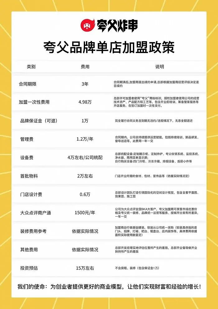 这与夸父炸串在公开信息中展示的加盟政策保持一致。