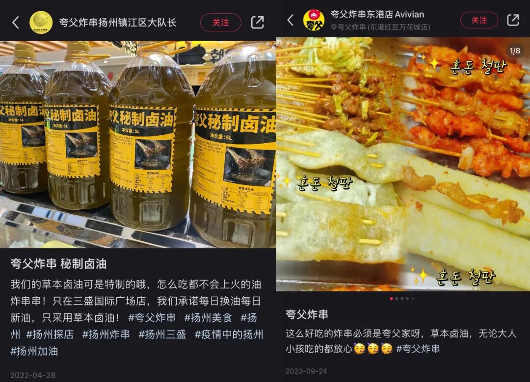 夸父炸串在不同的宣传体系中积极向健康化靠拢,聚焦的正是油——运用八角、桂皮、花椒等20多味卤料,配合产于四川本地的“初榨菜籽油”提炼而成的秘制“草本卤油”。