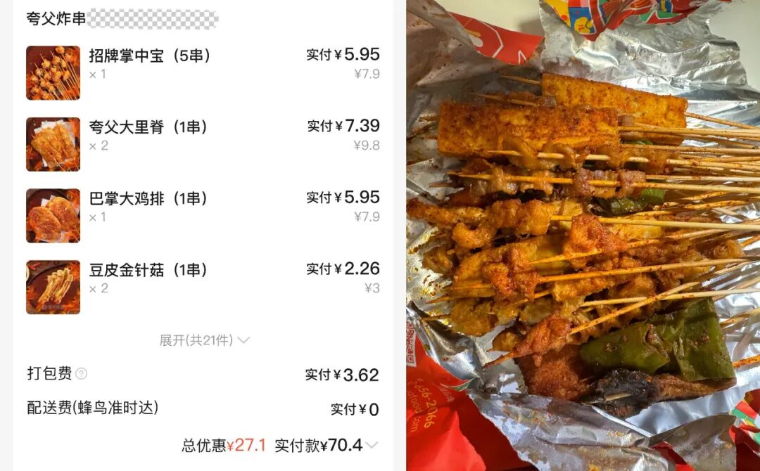 上述截图中的视频博主,在2022年9月购买了夸父炸串门店中的所有品类,共计38种串串(有些品类是5串或10串一份)和一份鸡排,总价211元,叠加多种优惠券后实付128元。