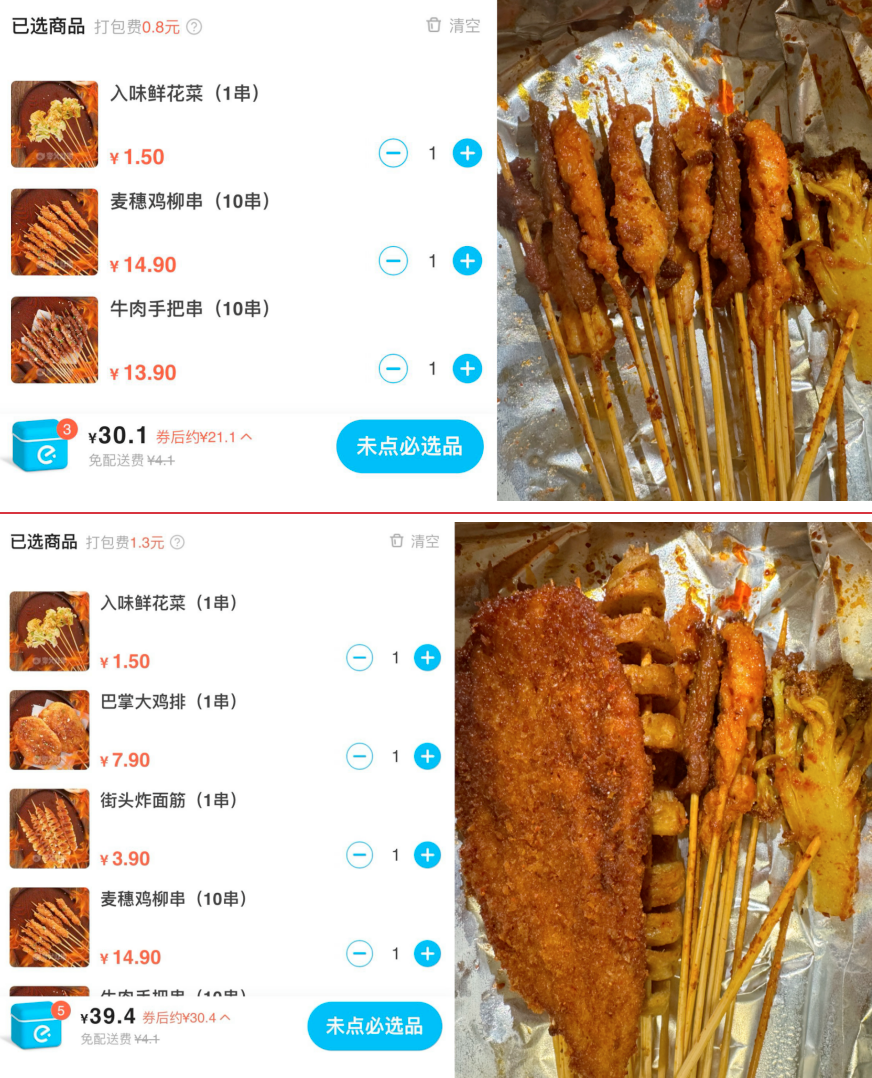 观潮新消费记者在外卖平台选购后发现,30元价位只能选择2份肉类和一串蔬菜类;叠加平台优惠后,可以再增加一个鸡排和一串炸面筋。