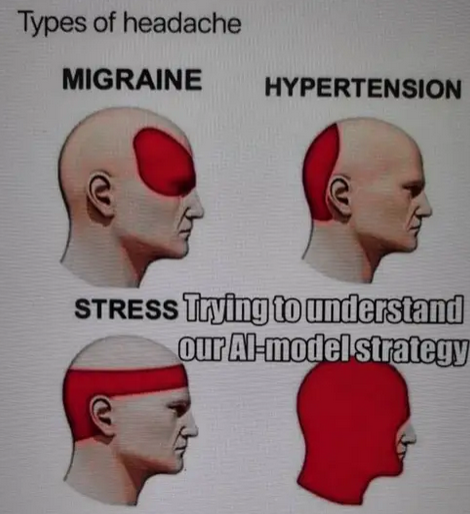这次谷歌在大模型上的各种产品,不光让外界眼花缭乱,也让员工头大。有员工给Business Insider爆料了内部梗图,比如偏头痛痛在前额,高血压痛在脑后,“试图理解我们的AI模型战略”痛在整颗脑袋。