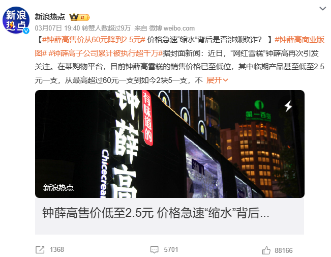 时间来到2024年3月,#钟薛高售价从60元降到2.5元#的话题席卷网络,价格急速缩水背后是否涉嫌欺诈的问题,不仅让钟薛高的贵立刻严肃了起来,也让林盛的“成本论”摇摇欲坠。