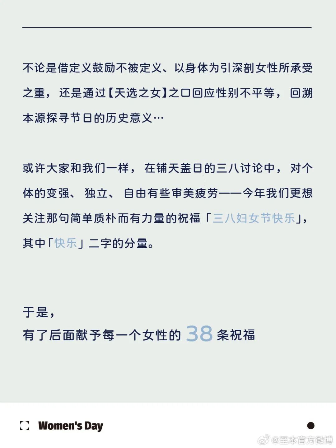 今年,至本回归到那句简单质朴而有力量的祝福「三八妇女节快乐」,想与大家分享其中「快乐」二字的分量。三十八条祝福,由衷地希望每一位女性都能接受到。