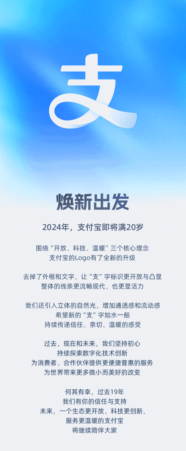 透过今年初20周年换Logo的大动作,支付宝承前启后地向大众进行了一番总结陈词。