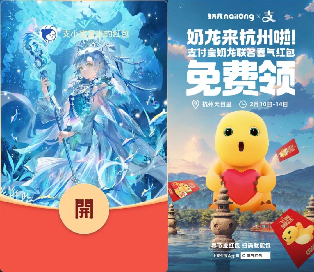 支付宝×奶龙联名红包,联名之外还与杭州、广州、上海等城市,银泰、大润发等品牌联动,以平台之力放大联名的价值;