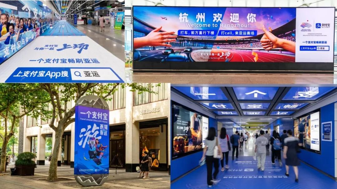 在亚运举办地杭州,针对亚运会的各种服务手册、明信片随处可见;地铁广告、商圈路牌也都是支付宝的身影。
