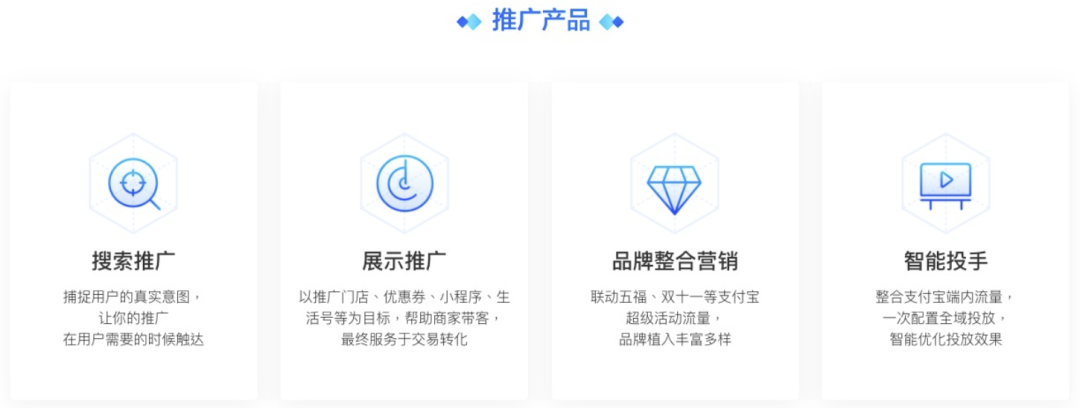 伴随着支付宝数字生活开放平台的升级,依托支付宝国民级APP流量,数字推广平台整合支付宝公域(搜索、支付后推荐等)、垂直业务域(支付宝会员等)、商家小程序私域联盟等全域流量及热门营销IP(五福、双十一等),为商家提供全域智能化的营销解决方案,推出如下产品矩阵: