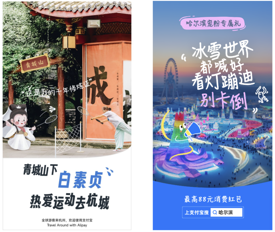 除了日常生活服务,还有与各省文旅单位的合作,夏天香港、冬天尔滨,大运会的时候带大家玩转成都、亚运会的时候请白素贞出旅游攻略……今年大火的各种文旅内容和体育赛事,支付宝没少蹭上热度。