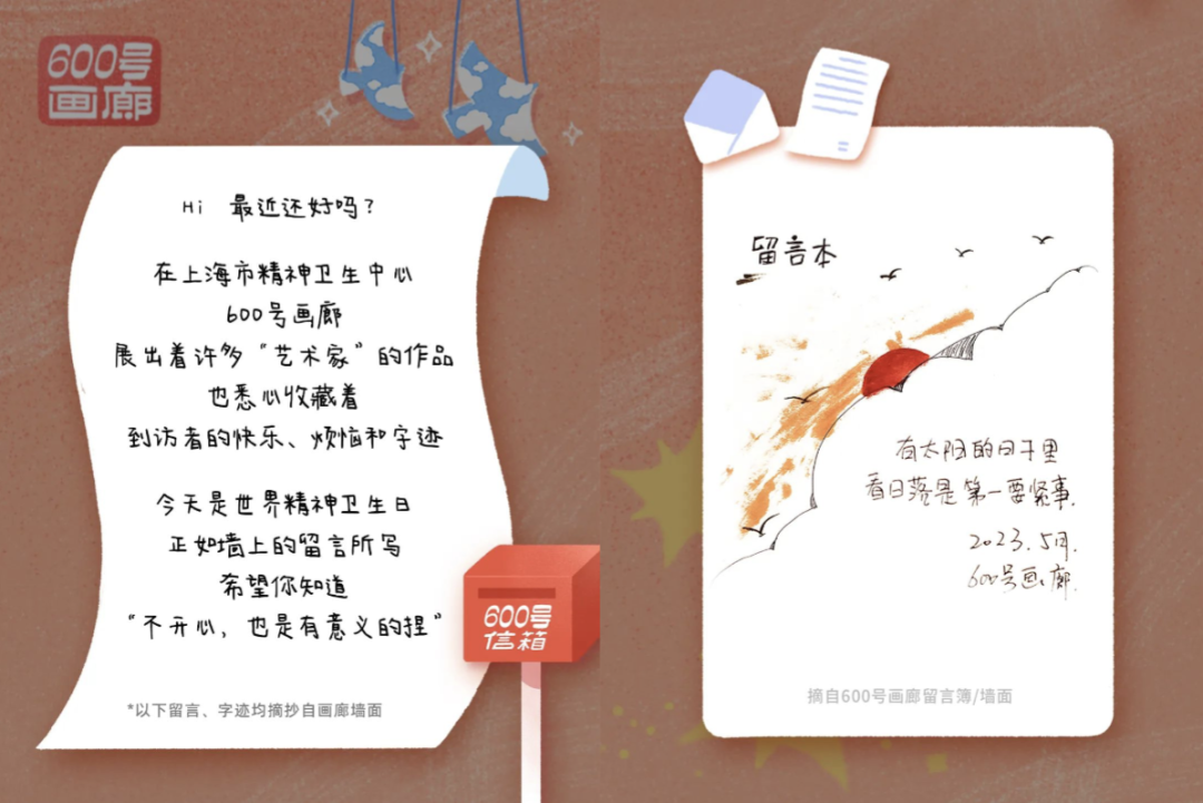 如在世界精神卫生日,与上海市精神卫生中心合作,在支付宝上线600号画廊,向大众倡议关注精神健康。