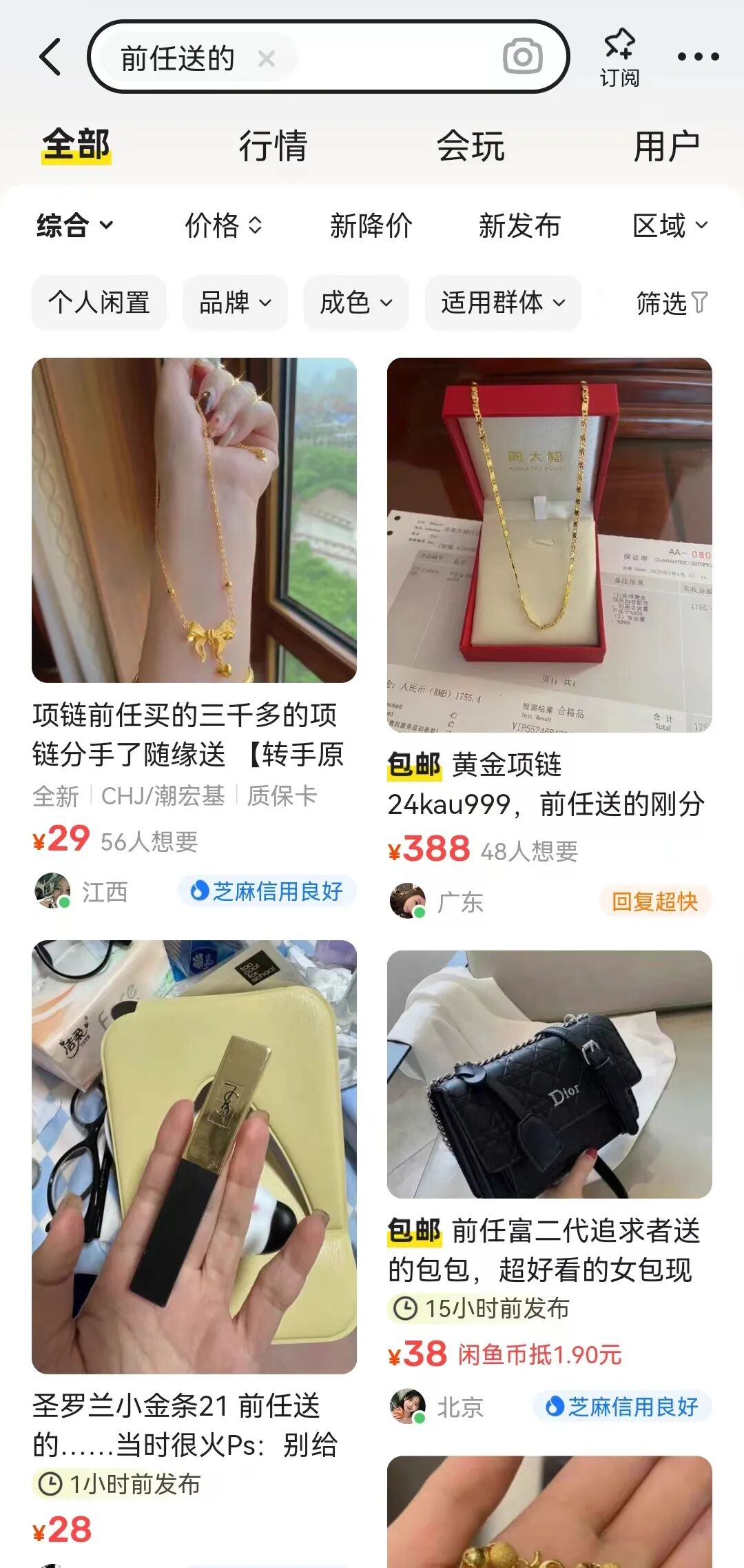 闲鱼自制爽剧与其他爽剧最明显的不同,在于其中女主的致富小技巧,背后都是由真实的闲鱼案例改编。比如苏七七把前任送的宝贝挂在闲鱼出售,赚到第一桶金,才有了与霸总抗衡的资本。现实生活中,在闲鱼上挂出前任礼物,已经成了一种现象级的风景线,在闲鱼上搜索“前任送的”,就能出现大把待转手的宝贝,甚至不少卖家还特意将“分手小作文”作为宝贝吸睛的亮点。