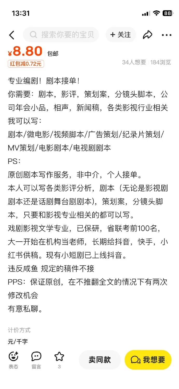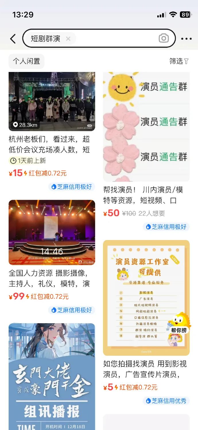 值得一说的是,闲鱼不仅自制爽剧,这个平台本身就是个巨大的短剧草台班子。打开闲鱼你会发现大量的用户发帖,有求跑龙套兼职的,有可以接短剧剧本的,还有租赁场地服务的,简直是一条完整的短剧产业链。鉴于《傅太太全程开挂》爆火,以及平台上用户自带的脑洞,闲鱼还发起了#闲鱼爽剧我来写#的剧本征集,由用户来定义要不要拍下一部,生动诠释了“我的爽剧我做主”。