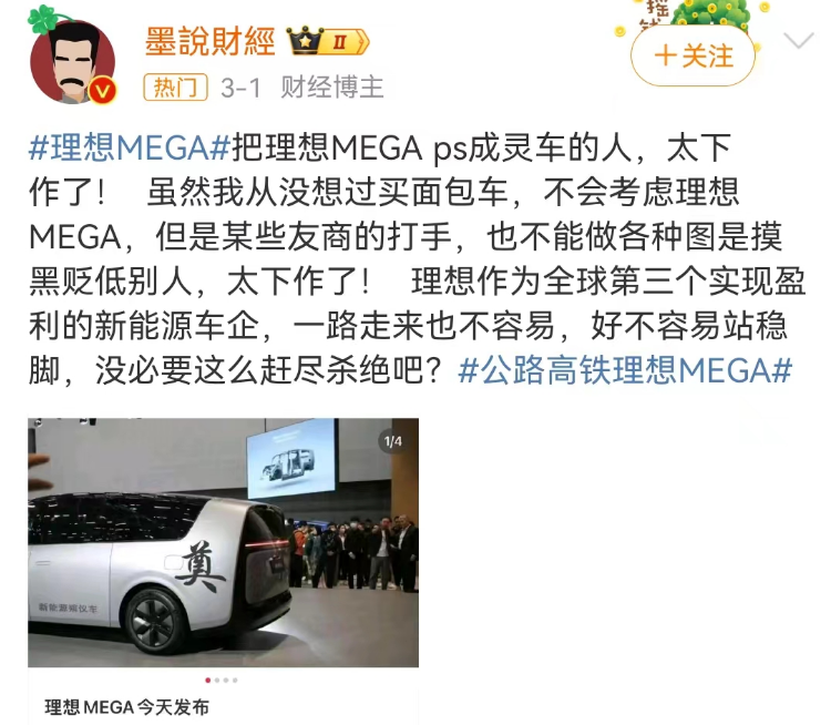 前段时间有网友爆改理想MEGA车型,进行一顿恶意P图,将“奠”和“新能源殡仪车”字样贴在车身,内涵理想新品是殡仪车。