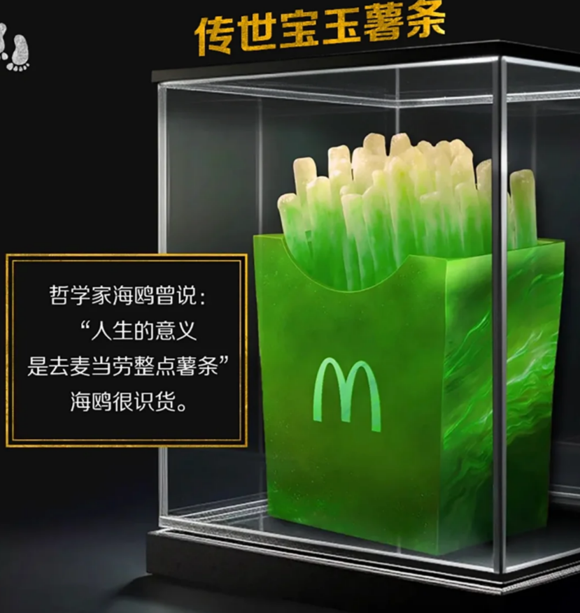 AIGC艺术家@土豆人Tudou man , 还对麦当劳巨无霸、可乐、麦乐鸡下手了,他们被AI成了由青铜器、青花瓷等材料制成的文物,陈列于麦麦博物馆的玻璃展示柜,还以为是传家宝。