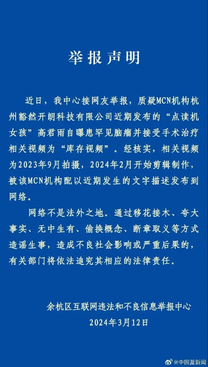 随后,涉事MCN机构杭州豁然开朗科技有限公司就此事发布致歉声明,承认公司在发布“高君雨患病”等视频上,文案中的时间表述出现严重纰漏。此外,还表示公司在此期间从未进行过任何捐款和打赏等盈利性操作。