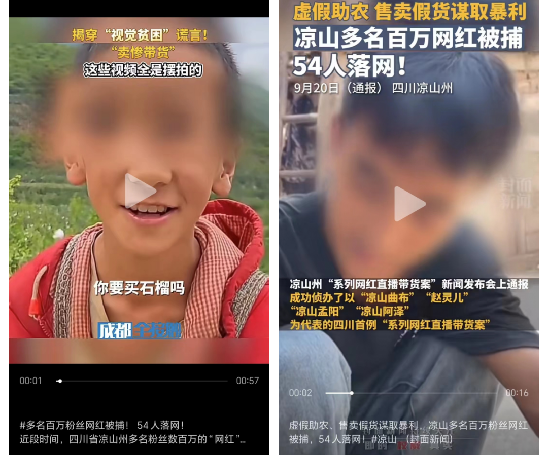 同时,这条视频讲述的也是一个励志故事。一个年少成名的小女孩,用自己的努力与实力,击碎一个个谣言与迎面泼来的脏水,是根正苗红的“别人家的孩子”。翻看高君雨以往的内容,其中也不乏带货视频。所以说,如果是因为缺钱治病才不得不出此下策也有点牵强。对于有路人缘基础的高君雨来说,想走网红道路没错,签约MCN机构也没错,错就错在操之过急、急功近利,错在不应该践踏大众的同情心。从前辛辛苦苦铺下的康庄大道,如今愣是走成了歪门邪道,高君雨可谓是亲手摧毁了自己过往努力建构起来的一切。其实她只要按部就班地走,正常讲述自己过去怎样对抗病魔以及现在恢复状况如何,也会取得一小波关注度。现在说什么都太迟了。这种不择手段取得的流量,最终都会被贪得无厌的欲望给反噬。在纷繁复杂的互联网世界,诸如此类的“卖惨营销”并不罕见。他们撰写的“狼来了”故事,一次又一次挑战社会信任体系,并加速其走向瓦解崩盘。去年9月,四川省凉山州通报了以“凉山曲布”、“赵灵儿”、“凉山孟阳”等百万粉丝网红为主要代表的“系列网红直播带货虚假宣传案”。这批网红自2022年以来,以剧本摆拍、凸显悲惨身世的短视频内容收割流量,甚至还雇佣“网络水军”涨粉引流、刷量控评,来达到高价售卖农产品谋取暴利的目的。看着这一张张“善良无公害”的淳朴脸庞,谁曾想他们背后竟然投靠了“吃人不吐骨头”的MCN机构。MCN机构为他们打造剧本、设计话术,搭建提高故事可信度的破破烂烂的表演场景,丰满他们生活贫困的“大凉山原生态”人设。通过在短视频平台发布“偶遇”、“蹭饭”、“助农”等情节内容博取眼球、获取流量。随后顺势开设网店,做起了“直播助农”的带货生意,而且卖的产品还以次充好、以假乱真。就像《楚门的世界》中的主人公一样,不过被蒙在鼓里的并不是镜头前的这帮“楚门”,而是同情、并用钱包支持他们的每一位网友。