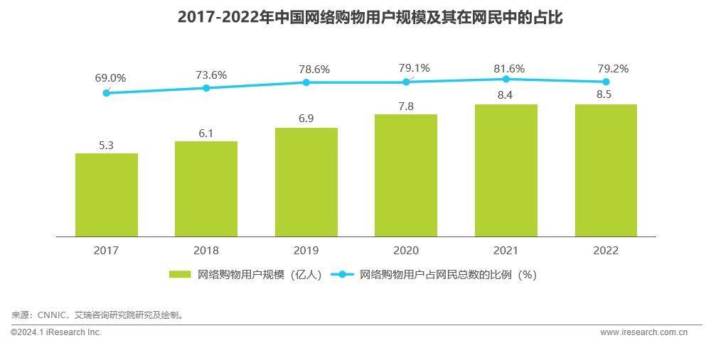 数据显示,截至2023年6月,中国网络购物用户规模达8.8亿人,较2022年12月增长3880万人,已经占到网民总数的82%。过去的2020年、2021年、2022年,三年一共增加了约1.3亿名网购用户,仅仅相当于2019年一年的增长。
