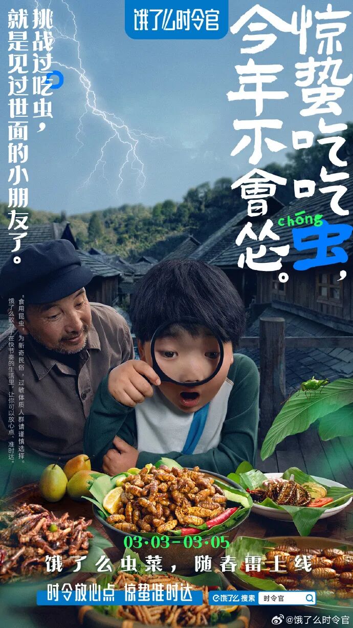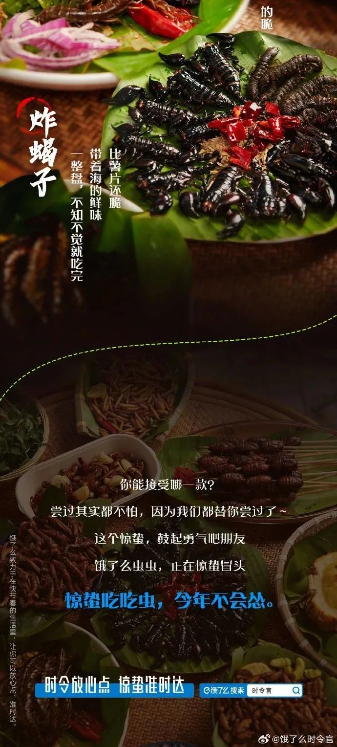 近日,当网友被惊蛰海报刷屏时,被一个品牌的创意抓住了眼球,饿了么时令官祭出奇招,以“惊蛰吃吃虫,今年不会怂”为口号,邀请大家惊蛰吃虫。