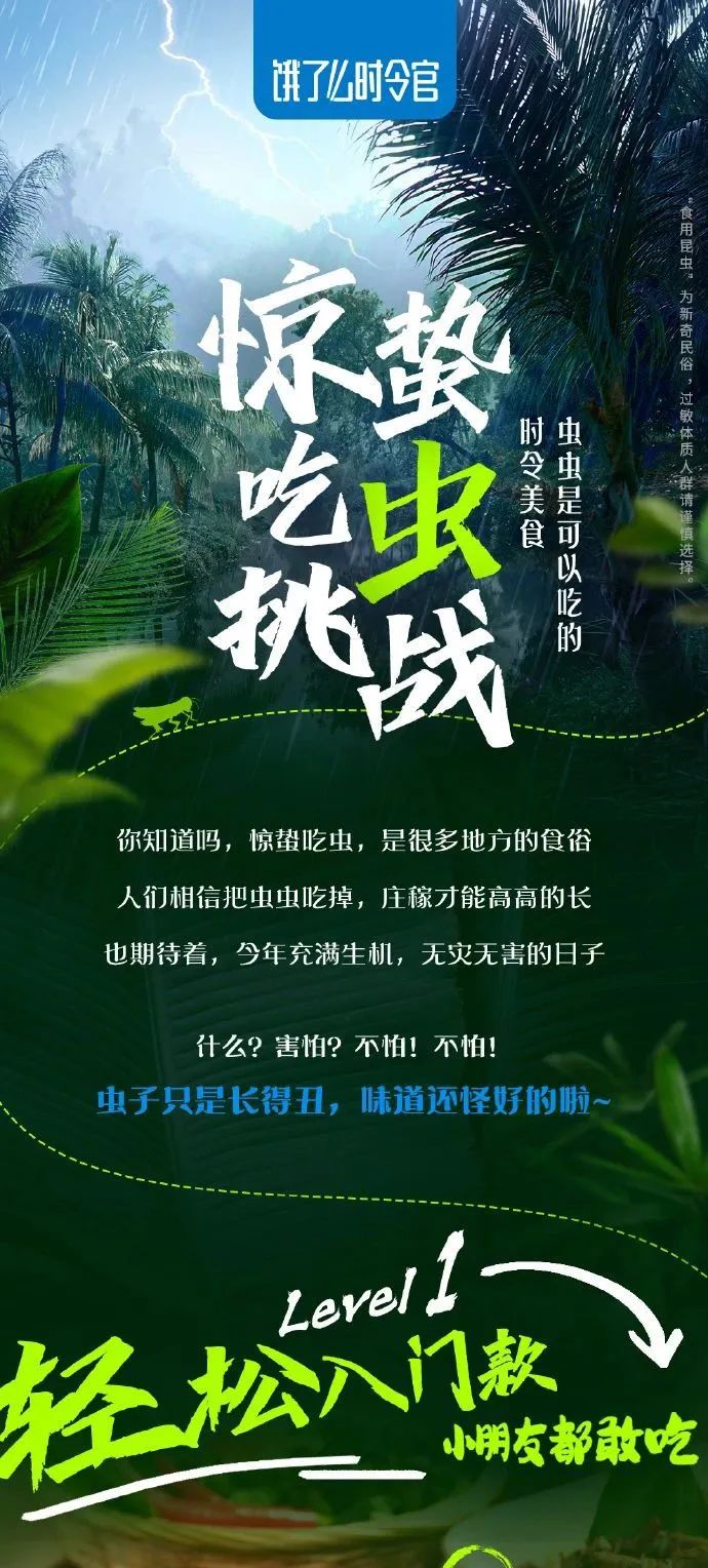 为了提升“非虫食者”们的参与度,饿了么提出一个“惊蛰吃吃虫,今年不会怂”的口号,鼓励大家做一个“见过世面的小朋友”,并发起一场吃虫挑战。