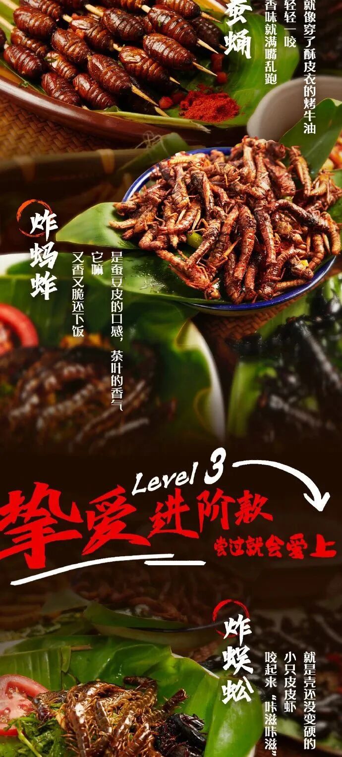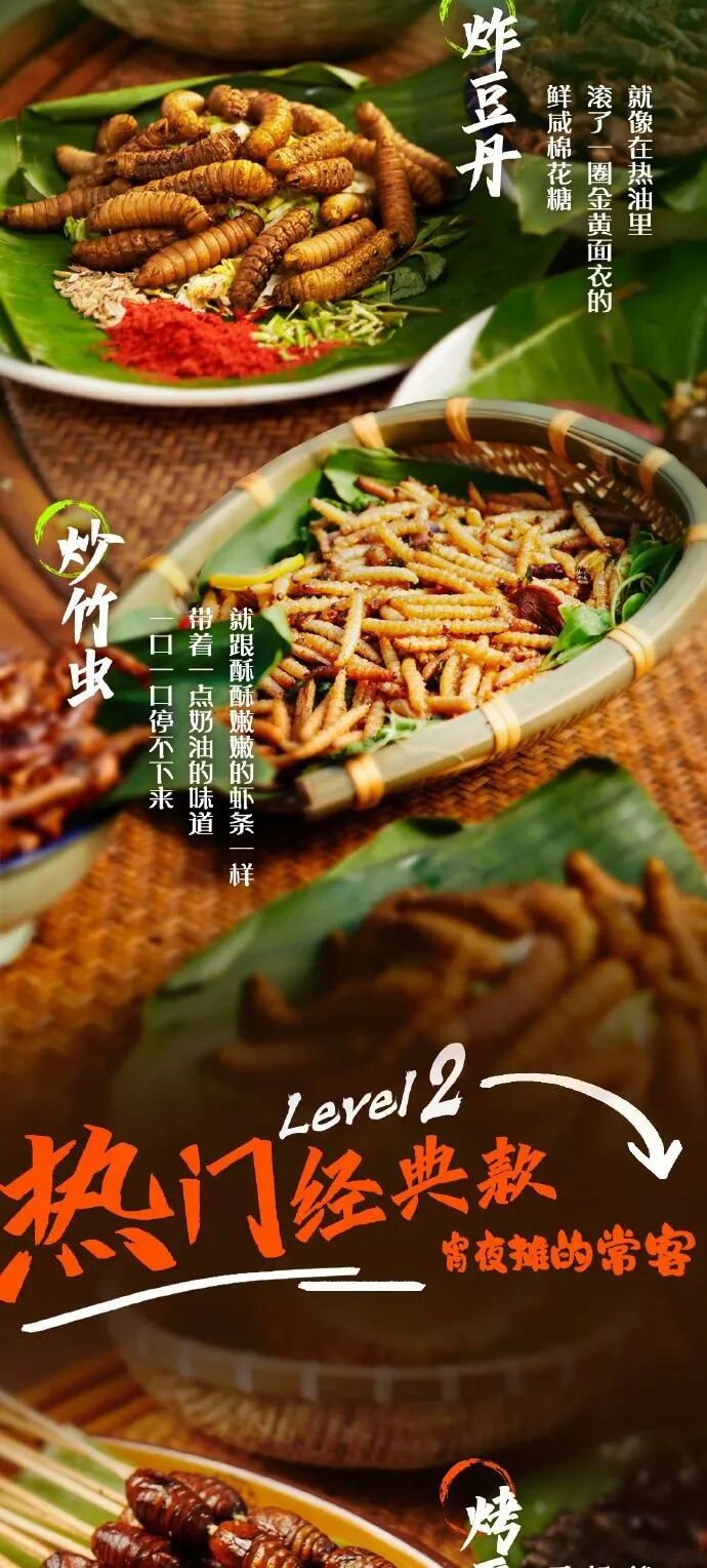 如果我们把“虫”字换个说法,烤蚕蛹、炸知了、炸竹虫……是不是听起来就舒服多了?即使不敢尝试,但也喜闻乐见。