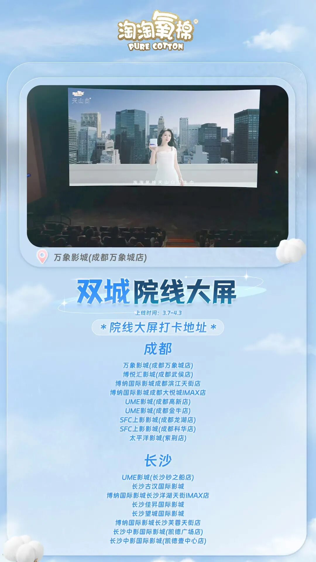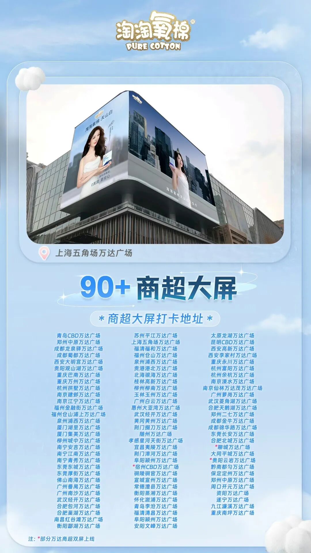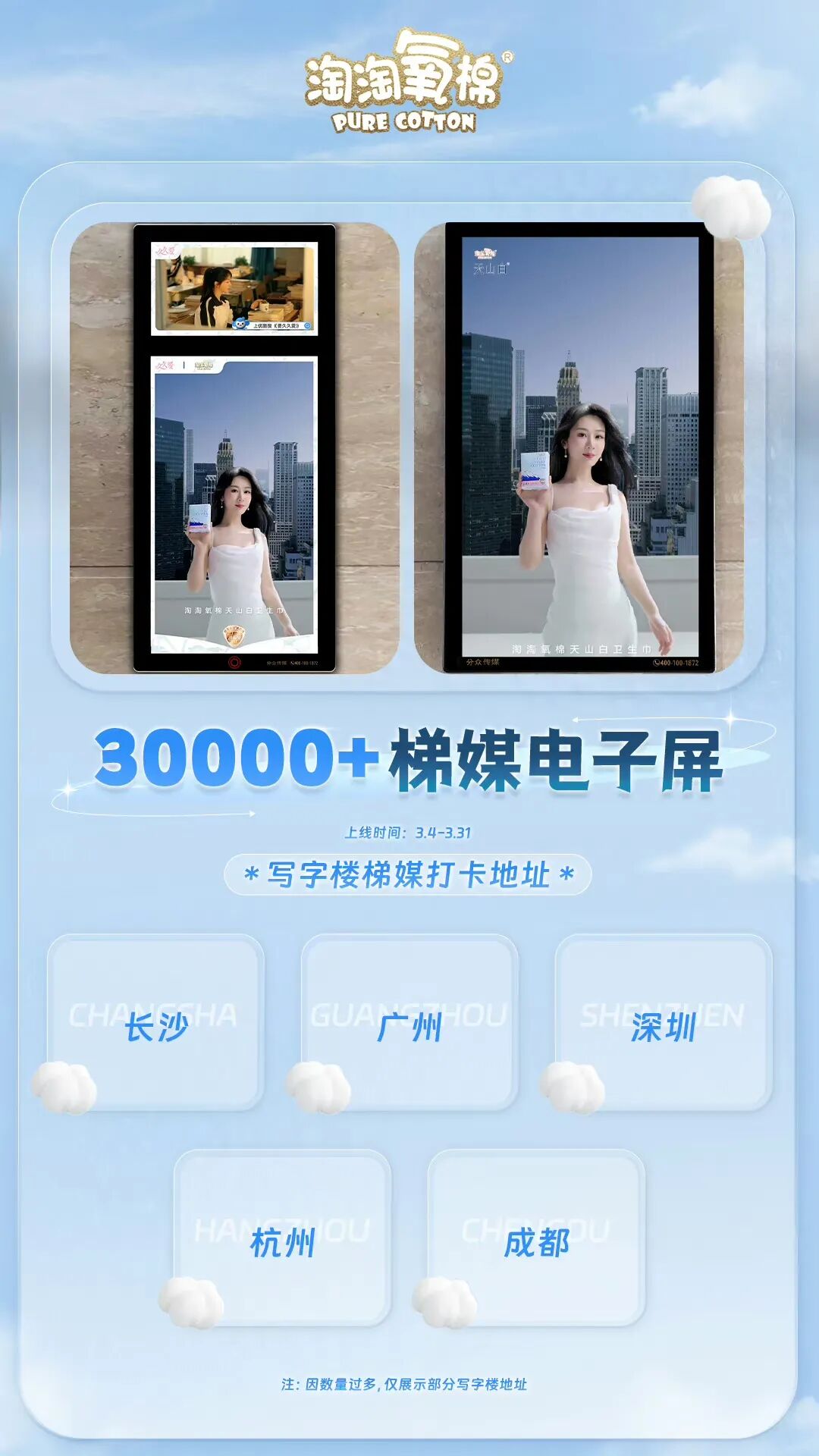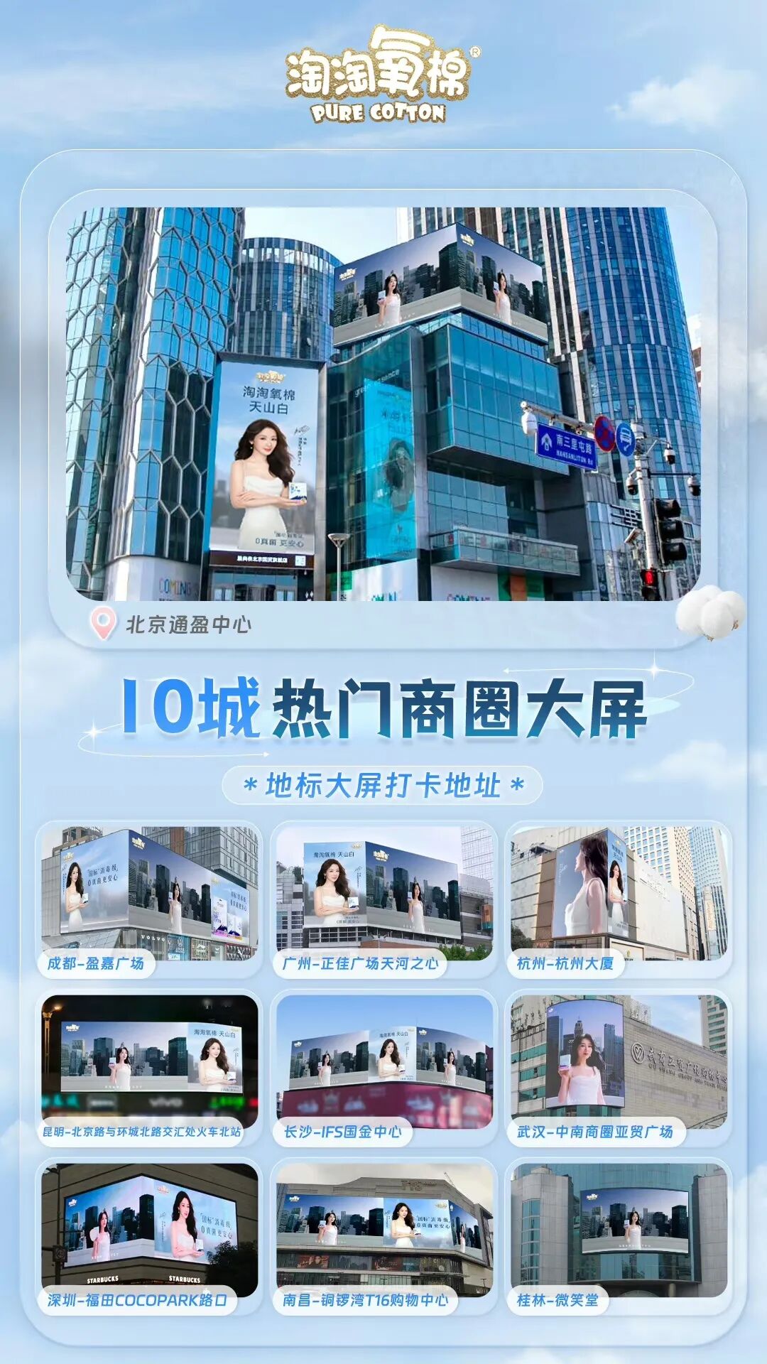 在线下,淘淘氧棉携手品牌代言人杨紫“现身”全国各地,覆盖北京、广州、成都等10+热门商圈城市地标大屏、30000+梯媒电子屏、成都、长沙双城院线大屏、90+商超大屏,多维营造沉浸式体验,完成全域全链的品牌角色认同深化,激发大众打卡热潮,强势实现心智占领。
