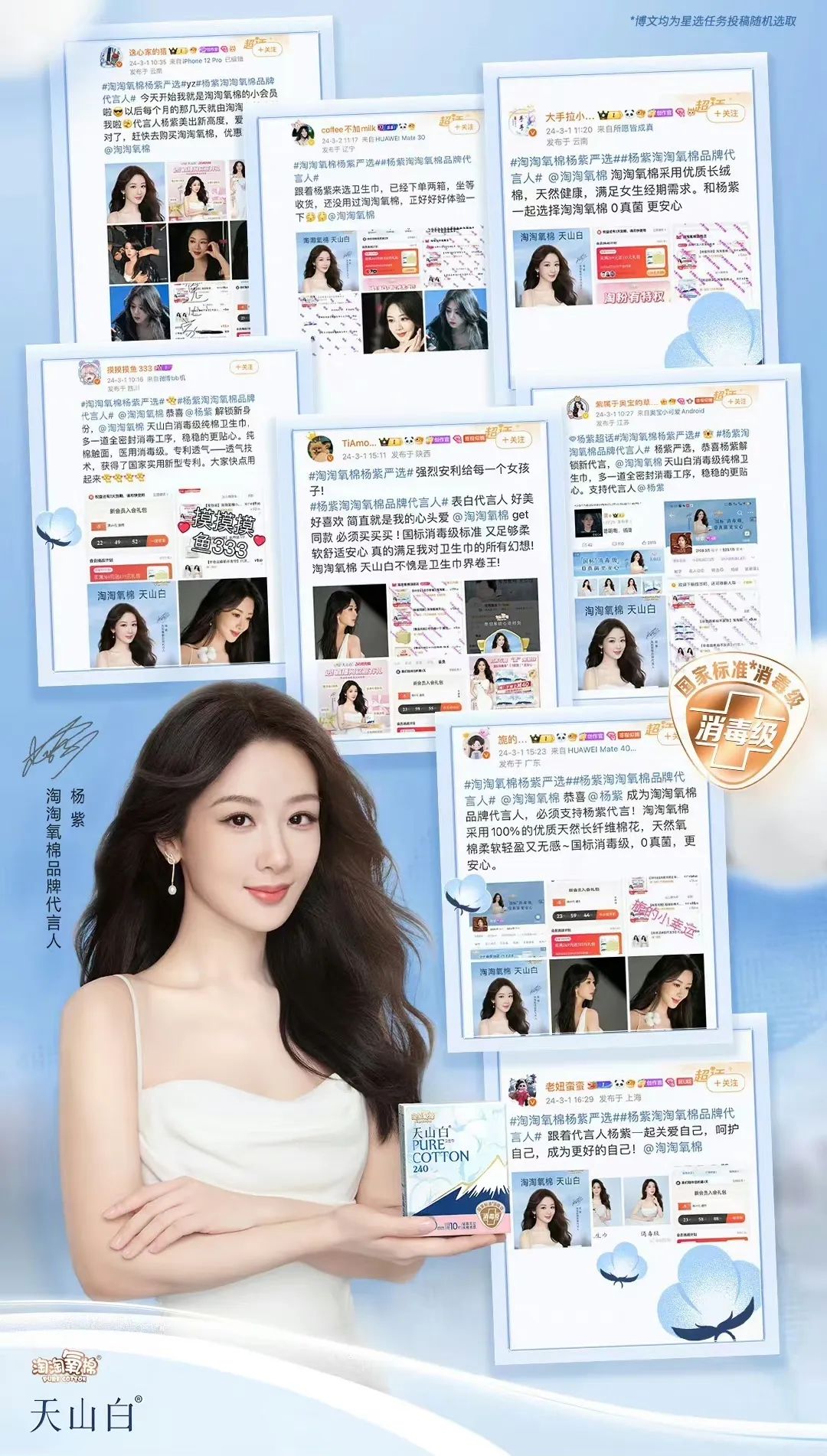 在此基础上,淘淘氧棉携手杨紫释出高能TVC,以「天山白」色系为主色调,与代言人杨紫共创视觉盛宴,通过感染力内容获得不俗反向,让更多消费者认识到“国标消毒级,0真菌,更安心”的淘淘氧棉「天山白」,打响【国标消毒级】产品广泛认知,实现代言人势能最大化。