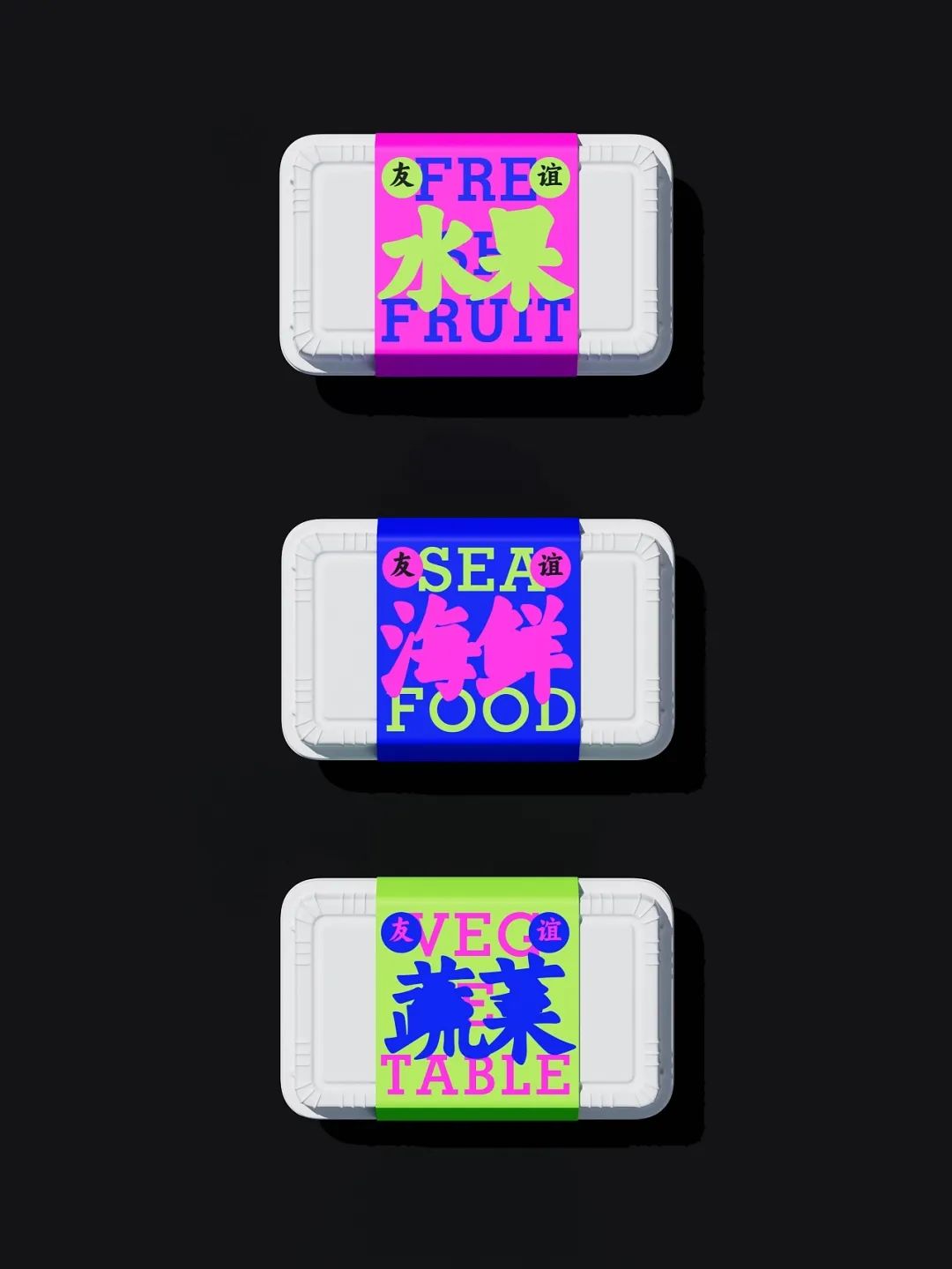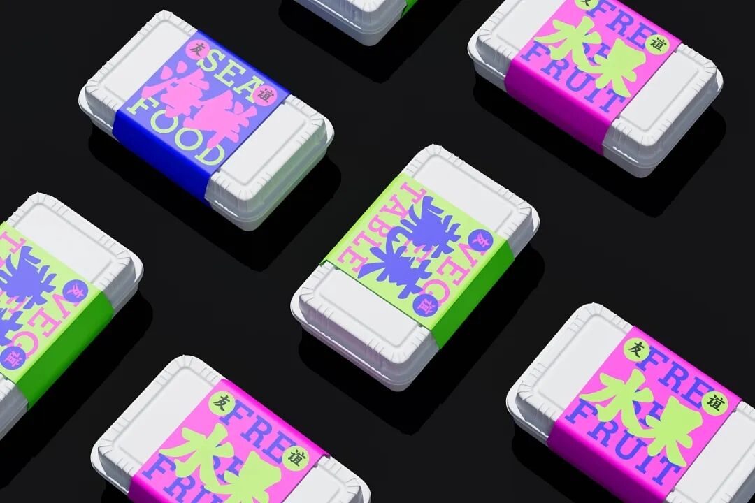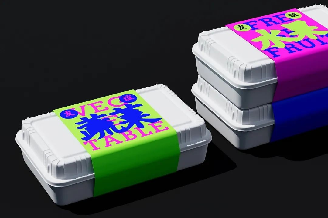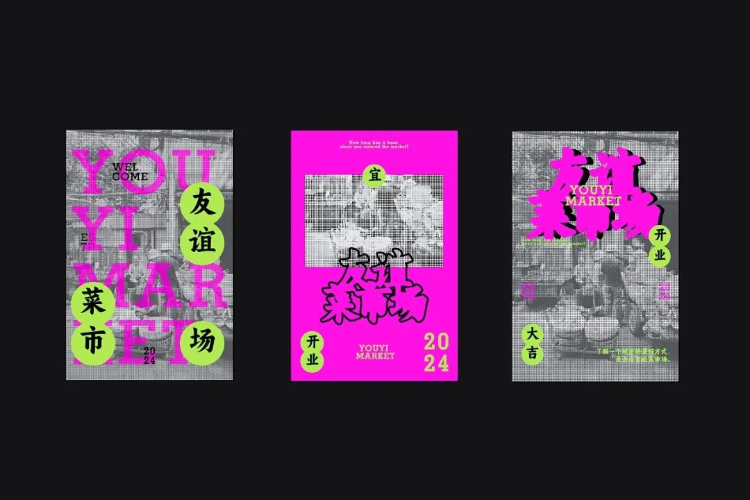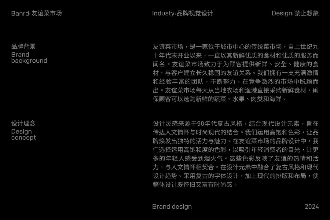 设计灵感来源于90年代复古风格,结合现代元素传达人文情怀。首先在色彩方面,以高饱和色彩为品牌色调,既让品牌焕发出独特的魅力,也能吸引更多的年轻消费者,让他们感受到菜市场别具一格的烟火气。而充满友谊的热情与活力的色彩,也进一步突出品牌的人性化关怀,有温度、有深度;搭配同样复古的字体设计,与背景色彩形成撞色效果,加上现代化的排版和布局,整体设计既怀旧又富有时尚感。