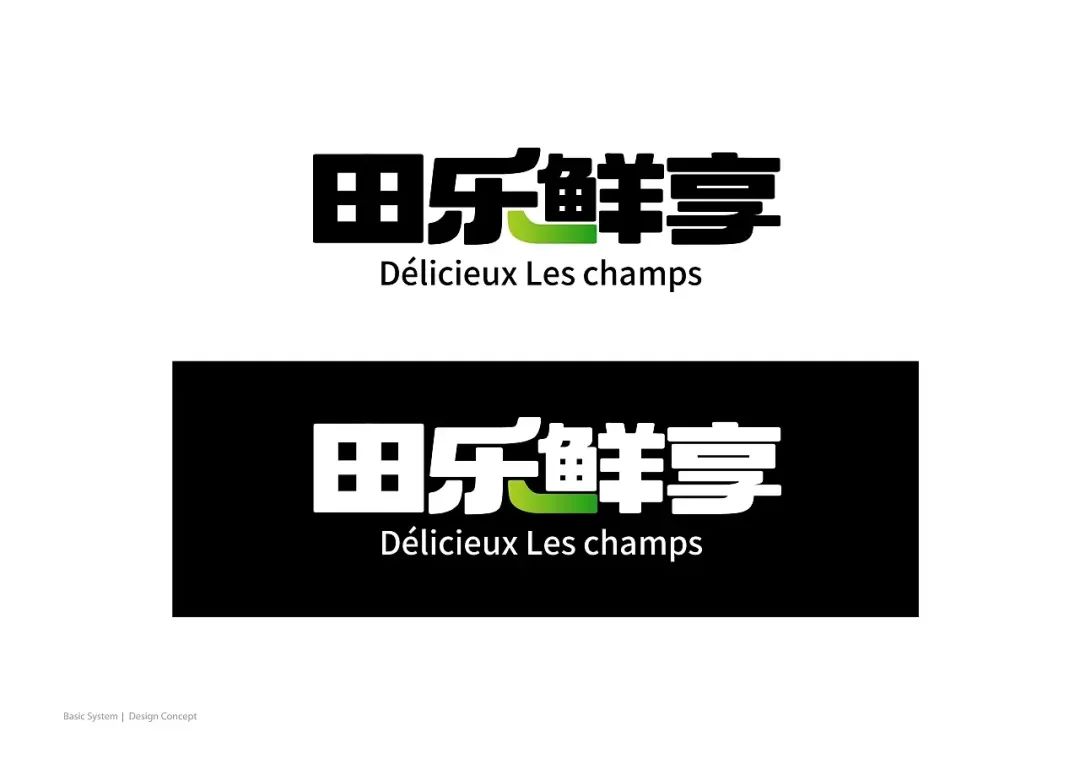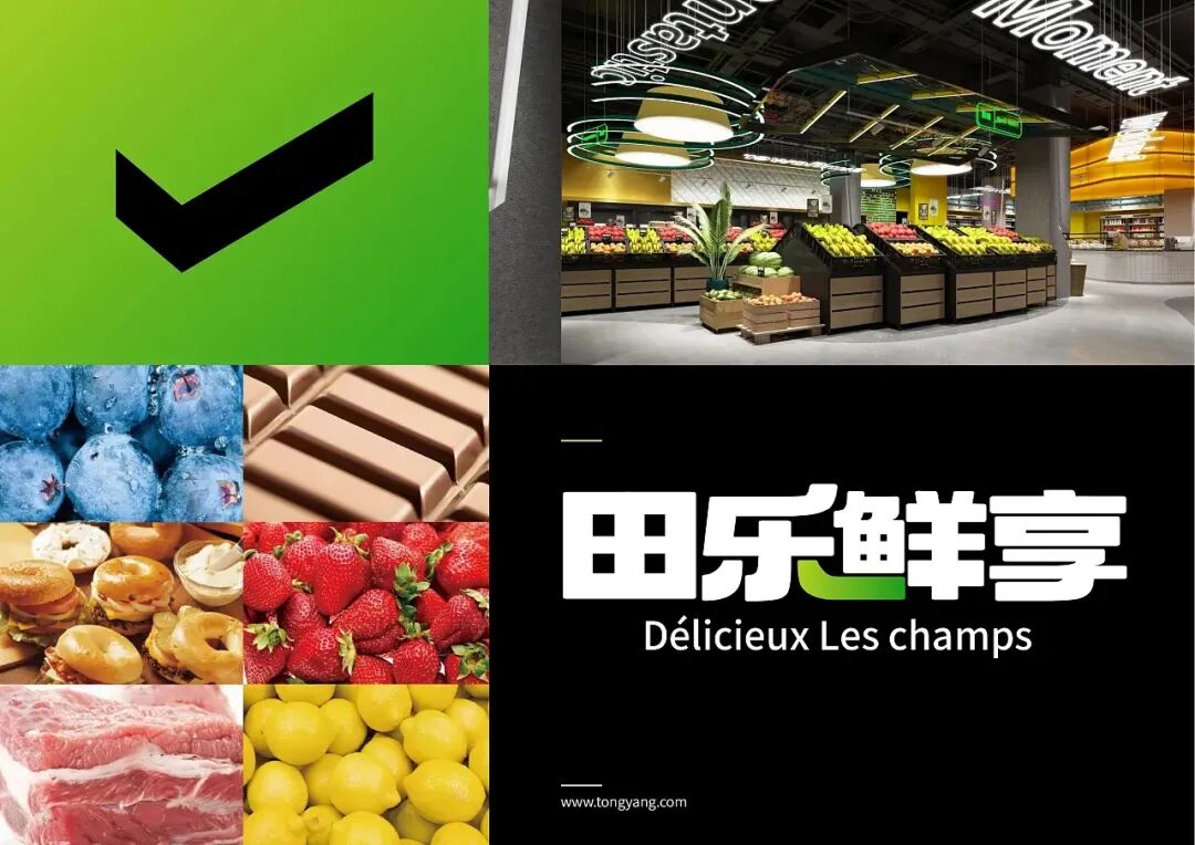 再来看到「田乐鲜享」品牌商超旗下的农副产品系列。这里集齐了全国各地地方特色的生鲜食品商品,品牌名更是以“鲜”为核心概念,并通过字体笔画的巧妙处理为品牌标志点缀一抹生鲜绿,清晰点明商品属性特色,同时又区别于以往传统商超的产品形象,整体更加时尚、年轻。