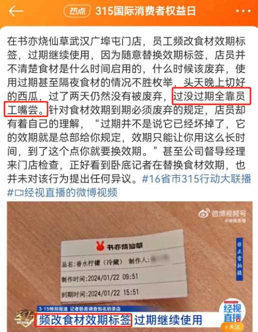 书亦烧仙草“草莓啵啵酸奶”涉嫌虚假宣传,600毫升饮品中仅含有70毫升的酸奶,不符合酸奶标准成分比例,被整顿改名“草莓酸奶水果茶”;更离谱的是,书亦被曝用嘴判断食材过没过期。