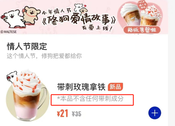 瑞幸估计担心“带刺的玫瑰”引起不好联想,同样做了温馨提示:本品不含任何带刺成分。