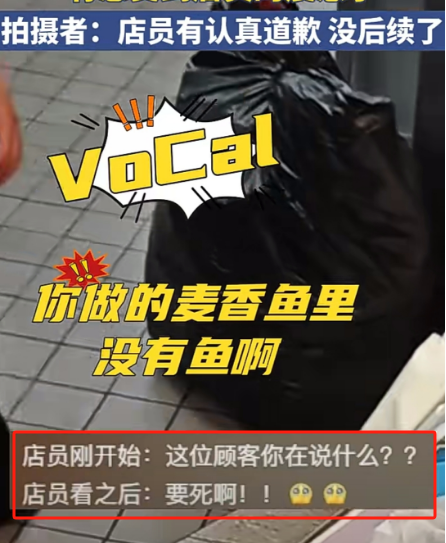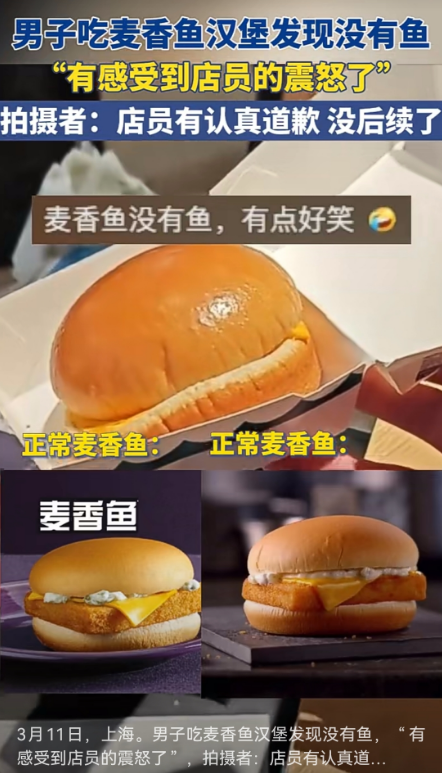有个消费者买了个麦当劳麦香鱼,发现被偷工减料,投诉“麦香鱼里没有鱼”。