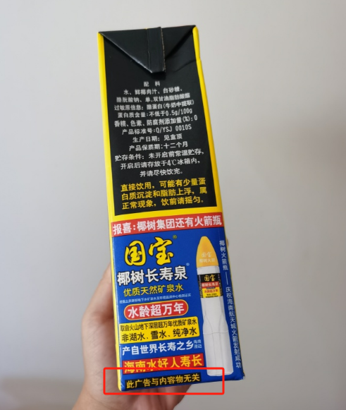 打广告卷就算了,关键是广告法意识也很卷,椰树还特地备注“此广告语与内容物无关”,这该死的严谨我服了。