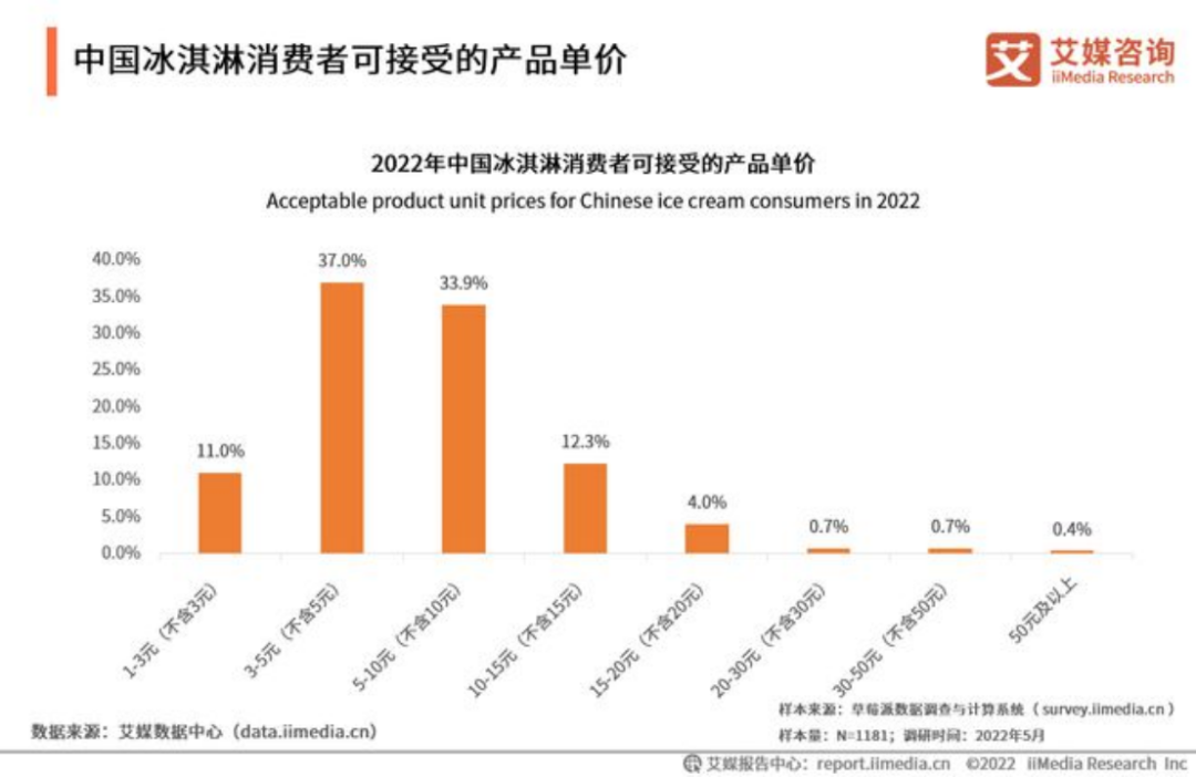 此外,根据艾媒咨询数据,2022年网友对单个雪糕的接受价位大多在3—5元,占比为37%;接受价位在10—20元的占比为16.3%;20元以上接受度仅为1.8%。