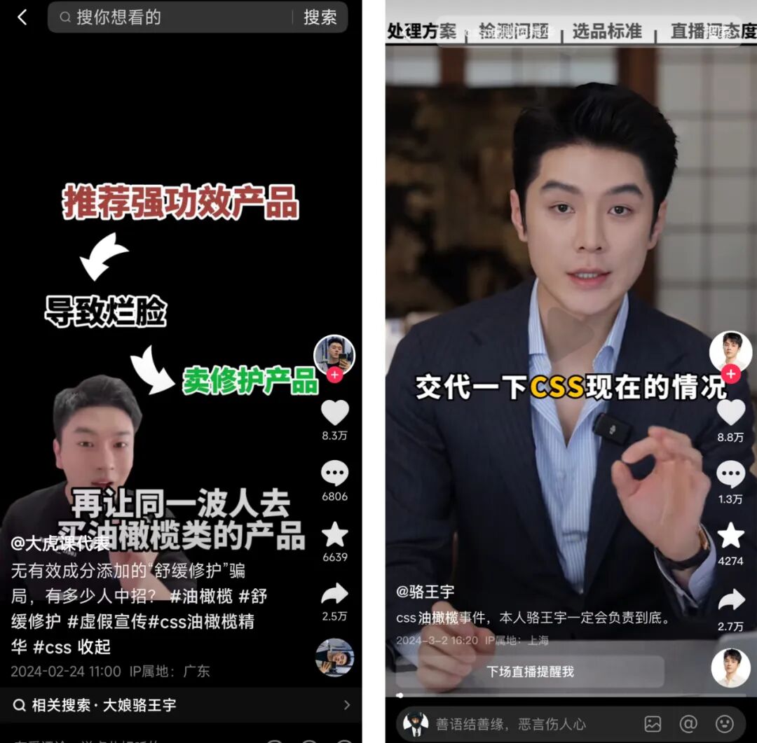 近期美妆圈还有一场网络事件也颇耐人寻味。2月24日,抖音美妆达人“大虎课代表”将6款热销油橄榄精华产品送检,其中CSS品牌(cosmetic skin solutions 希妍萃)油橄榄精华没有检出橄榄苦苷和羟基酪醇;“大虎课代表”喊话为该品牌带货的抖音知名美妆达人骆王宇。