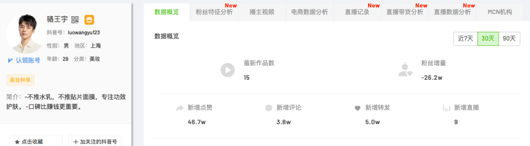 而骆王宇本人则因这次选品失误,口碑和粉丝大降。飞瓜数据显示,骆王宇本人在30天内掉了26.2w的粉丝;且他本人也被网友扒出,和CSS的幕后老板有更为复杂的交易关系,团队信誉再次被拉低。