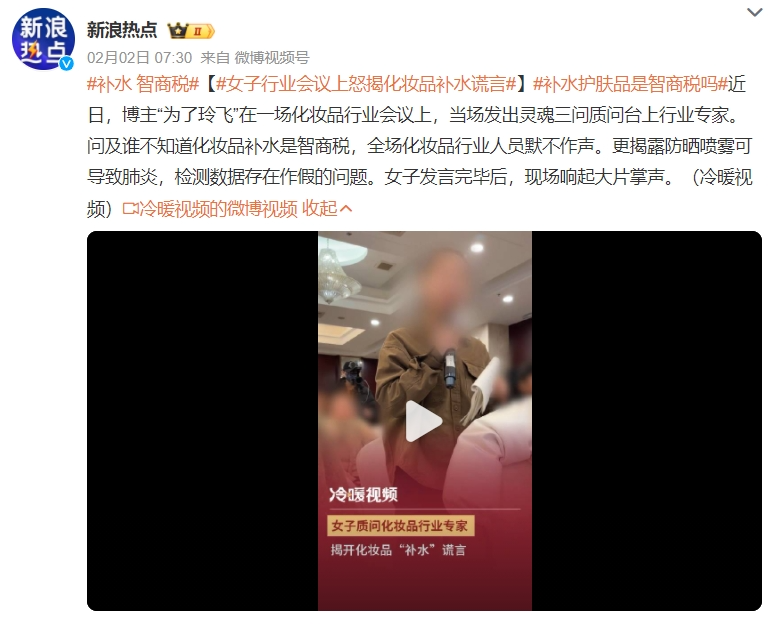 1月30日,自媒体账号“为了玲飞”发布了一条名为“一次得罪灵魂的拷问”的视频,视频中自称是“95后配方师”的女生在一场化妆品行业会议上,提出了“补水是智商税”的观点,并当场质问台上行业专家。视频发布后,关于“补水到底是不是智商税”的话题引起热议。