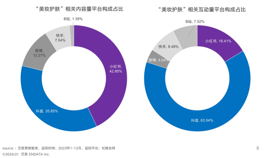 艺恩营销智库数据显示,纵观2023年美妆护肤品类内容量及互动量,微博份额占比并不突出,互动量甚至不及处在商业化“盐碱地”中的B站。在此背景下,多数美妆品牌已将投放重心迁移至抖音、小红书等渠道。