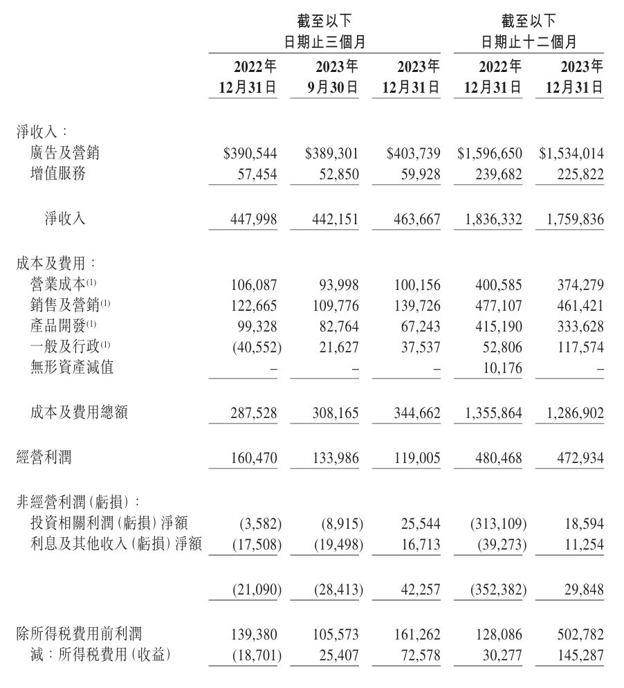 一直以来,微博的业绩表现,很大程度上取决于其广告业务。财报显示,2023年,微博广告及营销收入15.3亿美元,同比下降4%;增值服务收入2.258亿美元,同比下降6%;而第四季度,微博广告及营销收入4.037亿美元,同比增加3%。