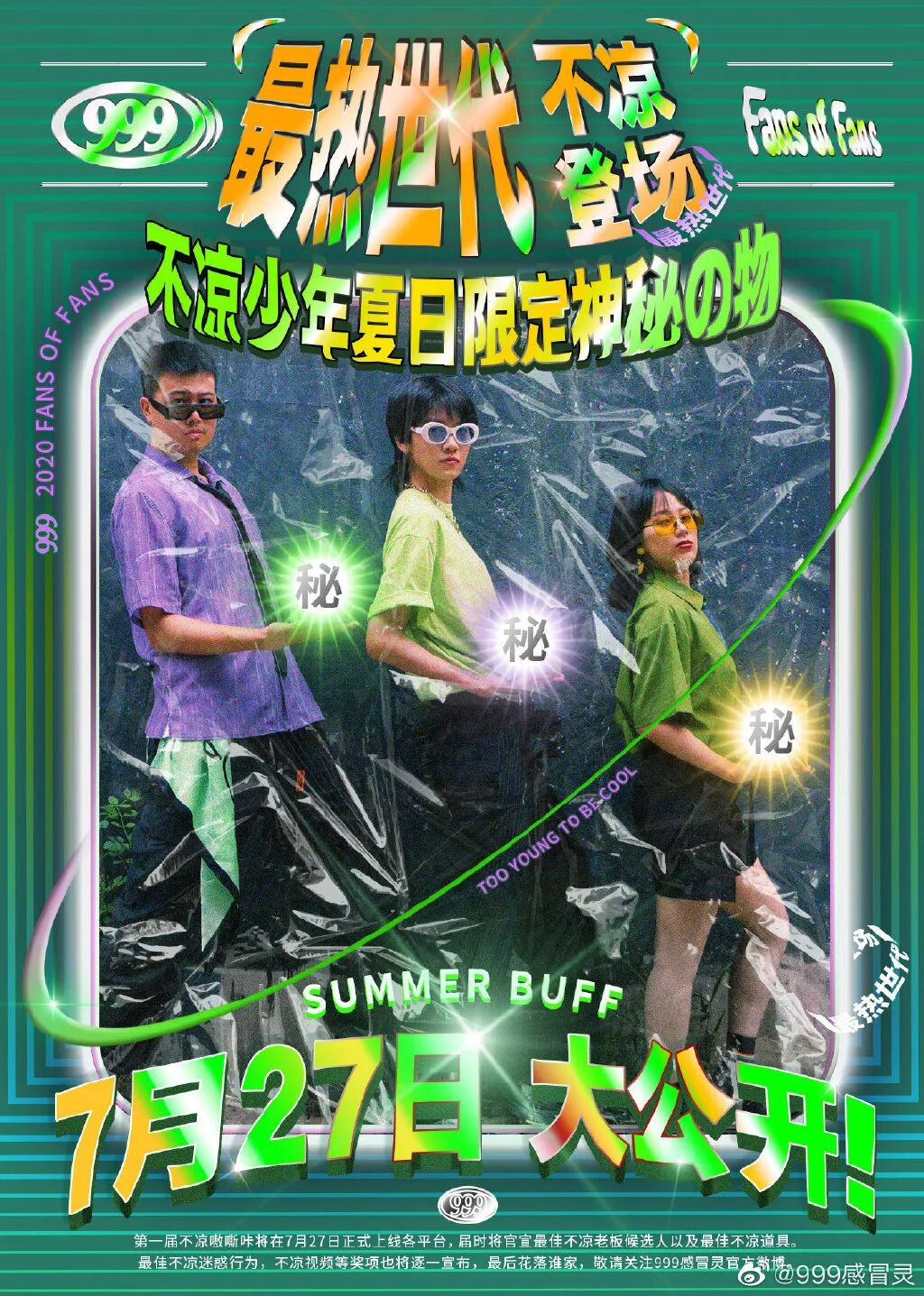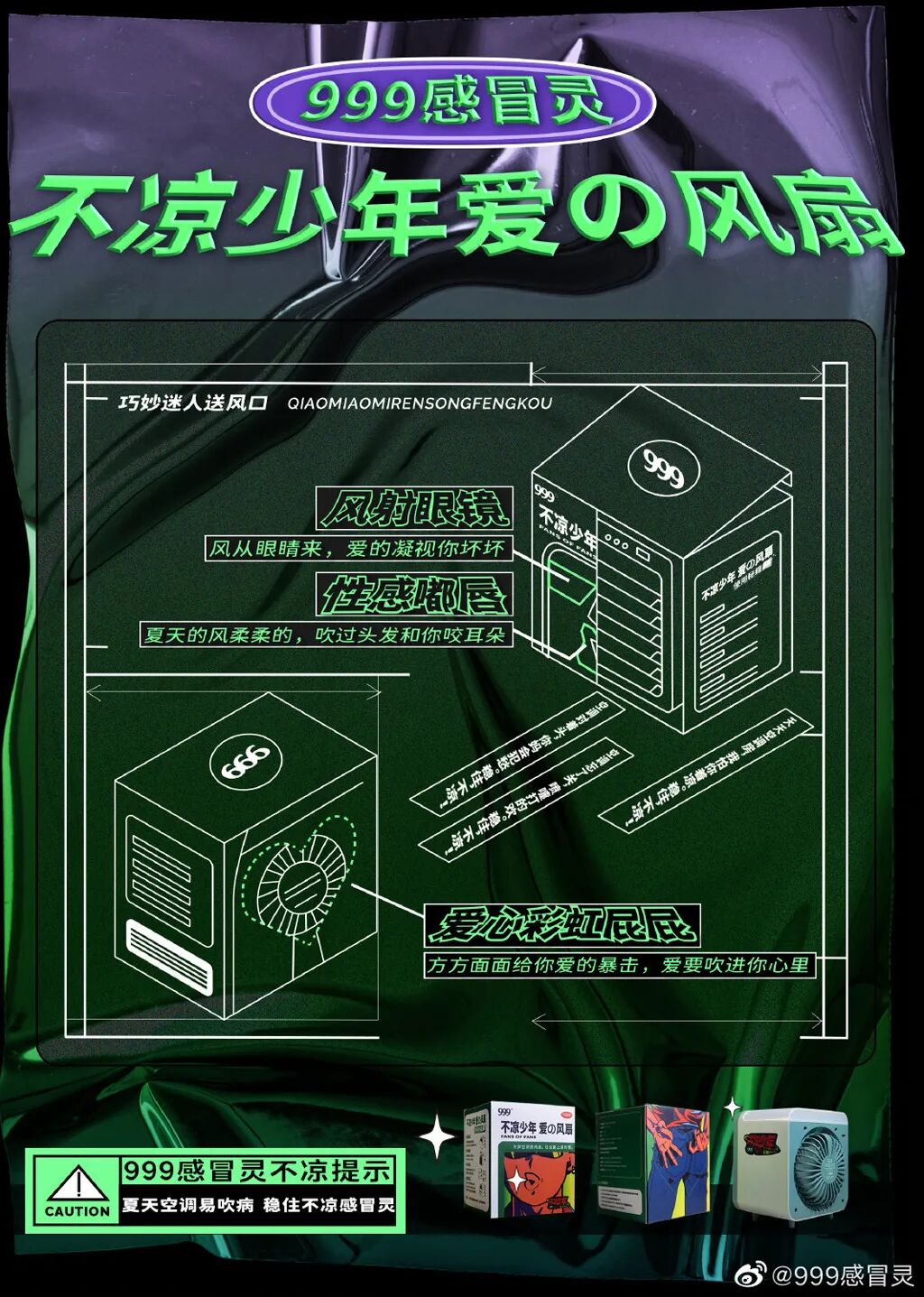 复古土味的电视购物场景、富有90年代的粗糙画质,配上5毛钱特效和一连串沙雕的文案.....不得不说,999感冒灵再次把沙雕营销玩出高级感。在短片中,999感冒灵塑造了三个典型的“不凉少年”人设,依托于三个夏天生活场景,揭秘成年人遭遇“凉凉”的情景——夏天尽兴喝酒、努力经营朋友圈等。结合出其不意的故事转折,直戳大众的笑点,由此不断加深“夏天吹空调易着凉,怕着凉有999感冒灵”的记忆点,让“稳住不凉”的品牌形象深入人心。尽管短片看着有点无厘头、不正经,但其实这个短片并不是空穴来风,而是999感冒灵为夏天跨界推出的“不凉风扇”宣传片。为此,999感冒灵还上线了系列辣眼睛的海报,可谓处处有梗,比如爱心彩虹屁屁、风射眼镜等,生动呈现了“不凉风扇”的产品特色,让人瞬间记住了这款有梗的风扇。在产品海报底下,还隐藏着999感冒灵的“不凉提示”:夏天空调易吹病,稳住不凉感冒灵。用“不凉”的反差语言来温馨提示,反而凸显999感冒灵有温度的形象。不仅如此,999感冒灵还将产品拟人化,为这款“不凉风扇”打造了一组表情包,将沙雕表情与产品特质完美融合,充分营造了“不凉势力闪亮登场”的画风。让风扇成为行走的表情包,为原本的产品加入了更多娱乐化的元素,深化“不凉风扇”的产品符号。当沙雕的产品人设有了,“不凉”的产品特色也随着传播出去。