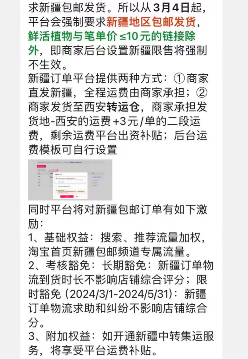 此外,淘宝平台还对新疆包邮订单给予相应激励,包括基础权益和考核豁免两方面。