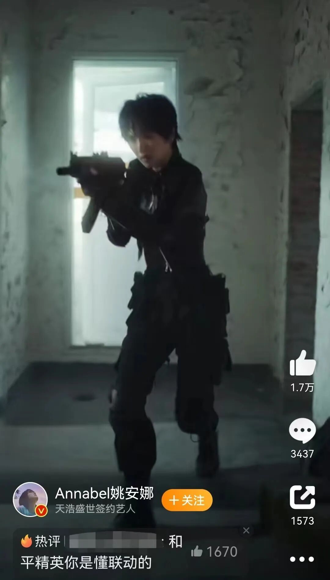 在这部宣传片里,作为特种兵的姚安娜一身黑衣装扮,举枪、搜房以及把作战信号打上去之类的动作都尽显专业。