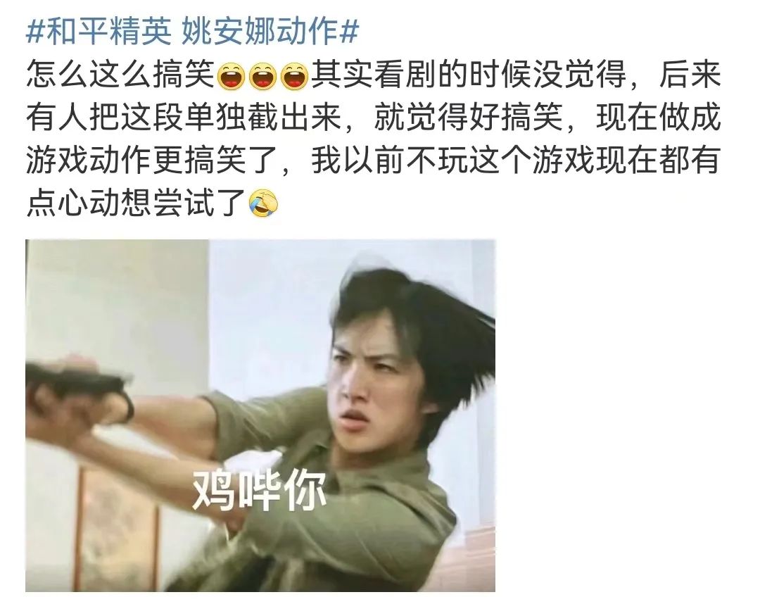 因为这组动作像极了和平精英的菜鸟玩家们,在海岛上落地的吃鸡反应,为此还有不少网友喊话和平精英——不如找姚安娜来代言。
