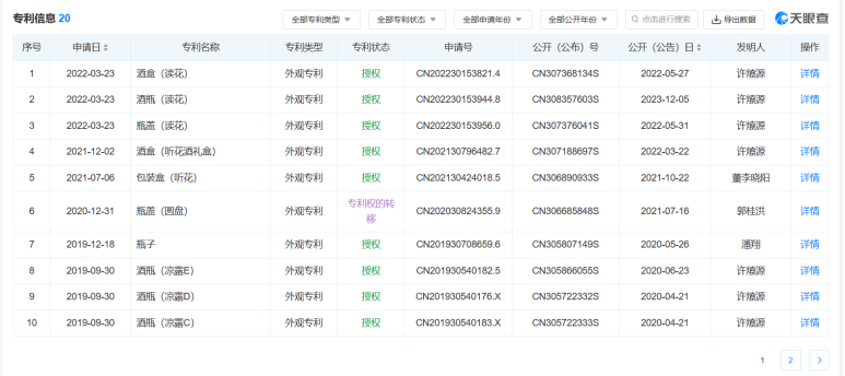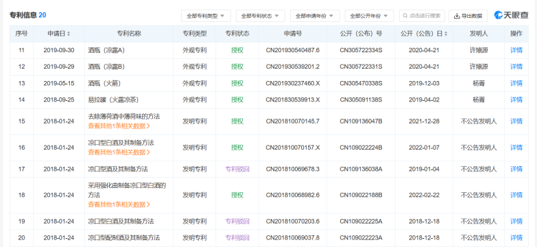 天眼查信息显示,听花酒所属公司宜宾听花酒业发展有限责任公司目前可查询的专利信息仅有20条,其中3条被驳回,17条获得授权(含一项专利转移),其中绝大多数为外观专利,“去除薄荷酒中薄荷味的方法”是为数不多的发明专利,该专利于2018年申请,2019年公布,2021年授权,也就是听花酒一直对外所鼓吹的“国际专利高科技凉味剂”。