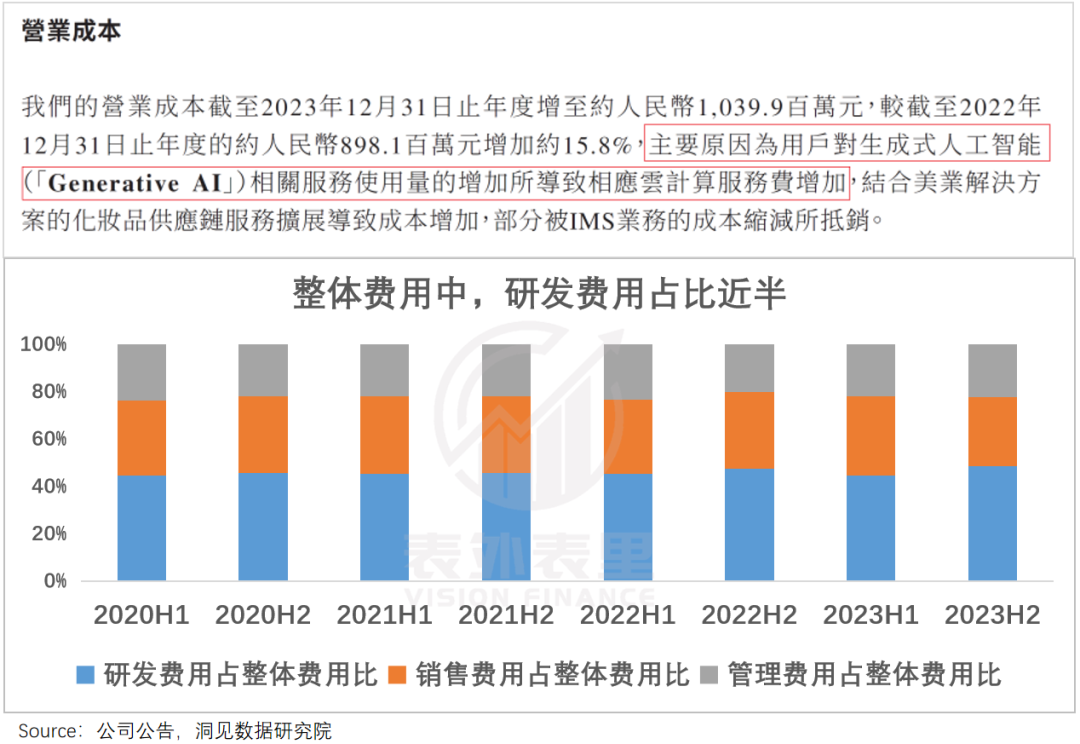 以美图为例,财报显示,因为AI相关云计算服务费的增加,营业成本居高不下。此外,这一季的研发费用,在整体费用中占比也高达49%,是连续9个季度以来的最高值。