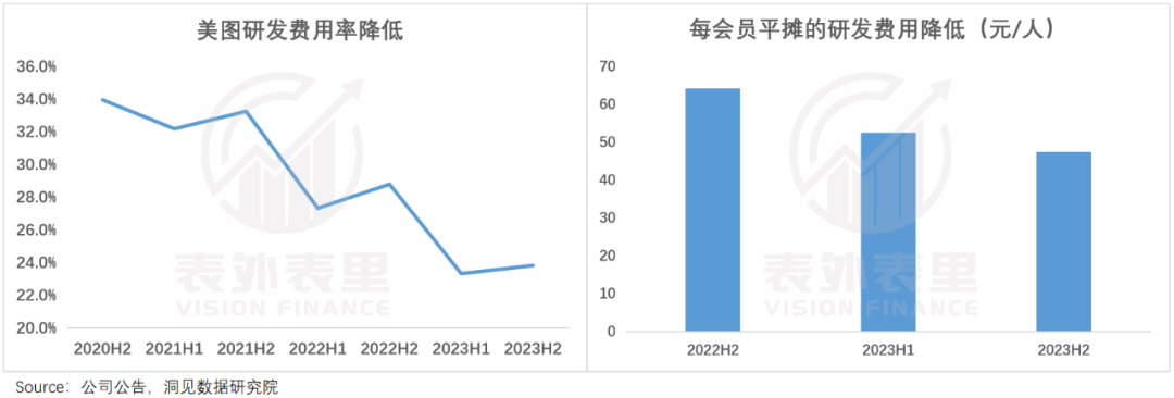 但美图却有些与众不同,大手笔投入下,其研发费用率和每会员平摊的研发费用在持续降低,这说明公司的研发效率在不断提升。