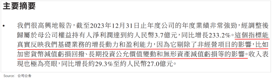 数据显示,2023年总营收27亿,同比增长29%;经调整后净利润达3.7亿,同比增长233.2%。
