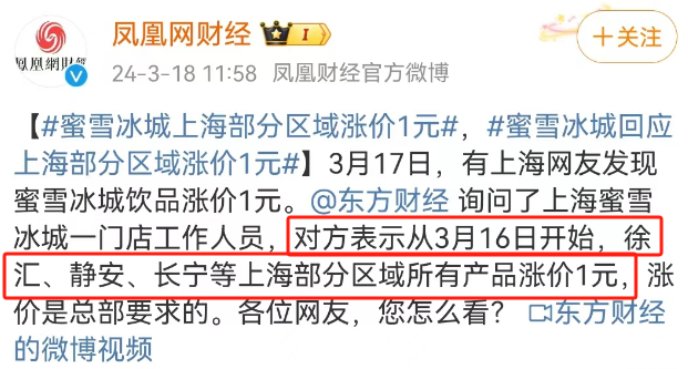 蜜雪冰城回应涨价只是先从上海开始涨价,而且还是上海部分地区,其他地方以后涨不涨还不好说。